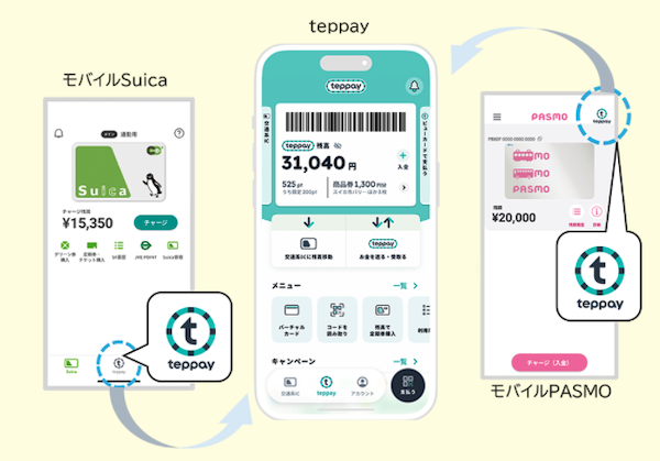 「teppay」は、「モバイルSuica」および「モバイルPASMO」のアプリを通じて提供され、追加のアプリダウンロードや新規登録は不要。既存アプリ内でそのまま利用できる。