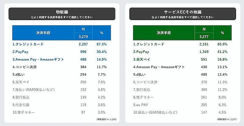 よく利用する決済手段を聞いたところ、物販においては最多が「クレジットカード」で67.3%、続いて「PayPay」30.4%、「Amazon Pay・Amazonギフト」が14.9%、「コンビニ決済」が11.7%だった。