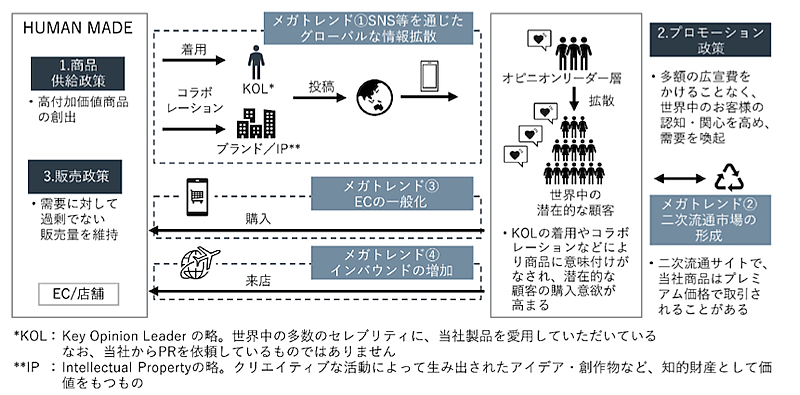 HUMAN MADEのプロモーションには特長がある。広告枠を活用した一般的な広告宣伝活動は実施せず、自社SNS、クリエイター、アーティスト、ミュージシャン、グローバル展開する企業とのコラボレーションを通じて商品情報を発信し、ファンを獲得している。