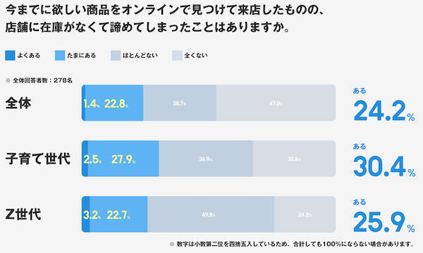 オンラインで店舗在庫を事前確認しない回答者に対し、今までにオンライン上で欲しい商品を見つけて来店したものの、店舗に在庫がなくてあきらめたことがあるかを聞いたところ、「よくある」が1.4%、「たまにある」が22.8%で、合計すると24.2%だった。