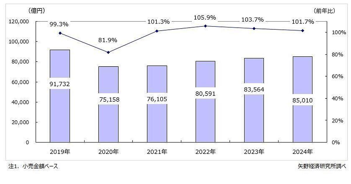 矢野経済研究所が発表した国内アパレル市場に関する最新調査結果によると、2024年の国内アパレル総小売市場規模は前年比1.7%増の8兆5010億円と推計、4年連続でプラス成長を記録した。新型コロナウイルス感染拡大前の2019年比では約93%まで回復している。