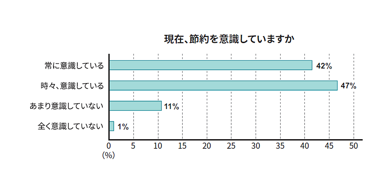 節約意識について、「常に節約を意識している」が42%、「時々意識している」が47%で、全体の約9割が節約志向を示した。
