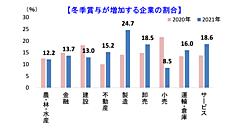 帝国データバンクが12月9日に公表した2025年冬季賞与(ボーナス)の支給動向に関する調査結果によると、支給額が「増加」した企業は22.7%、業界別の増加割合では「運輸・倉庫」が33%でトップ、「小売」は15%だった。