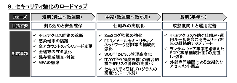 短期フェーズでは「封じ込めと安全確保」をテーマに、不正アクセス経路の遮断、EDR強化、残存脅威の調査・対策、MFA導入の徹底などを最優先で実施。