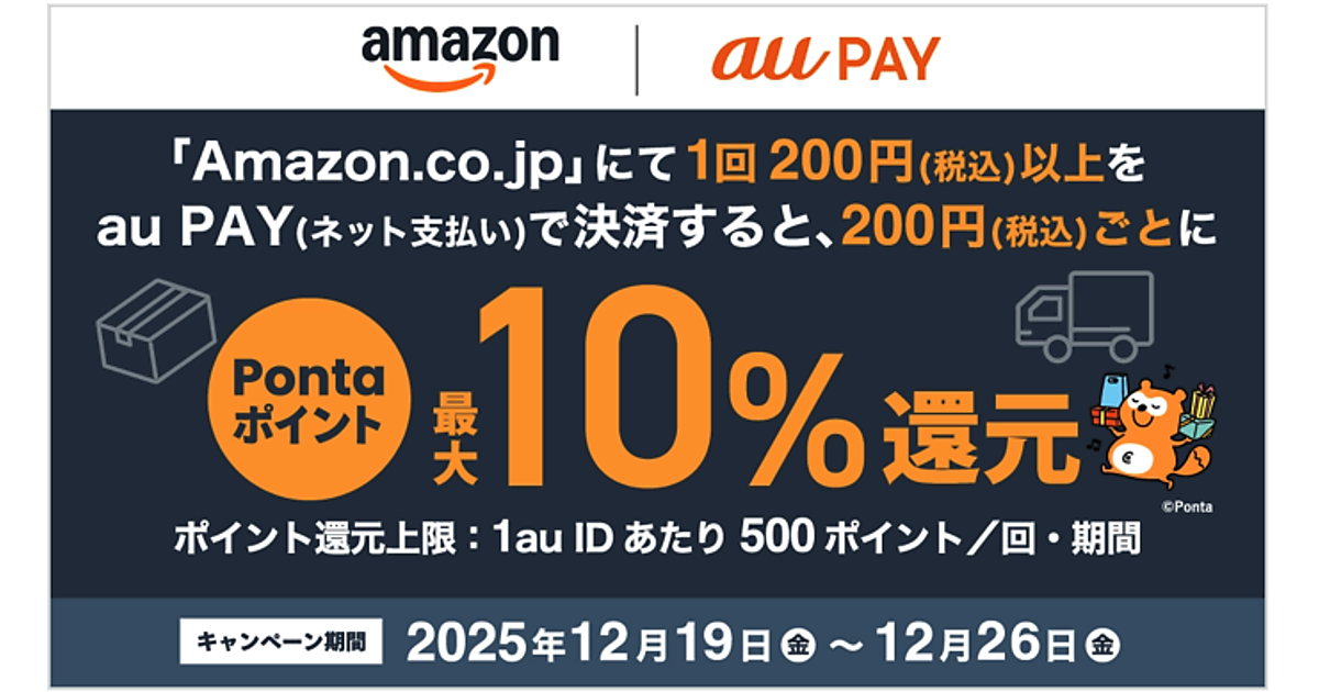 KDDIとauペイメントは導入を記念したキャンペーンを実施する。12月19日から12月26日までの期間中、「Amazon.co.jp」で税込200円以上を「au PAY(ネット支払い)」で利用すると、税込200円ごとに最大10%の「Pontaポイント」を還元する。還元上限は1au IDあたり500ポイント。また、2026年1月3日から1月12日までの期間中に、「Amazon.co.jp」で税込200円以上を「au PAY(ネット支払い)」で利用したユーザーを対象に、抽選で1万5000人に1000Pontaポイントが当たるキャンペーンも実施する。