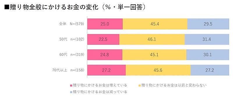 3年前と比較した際の贈り物全般にかけるお金について聞いたところ、「以前と変わらない」が最多で45.4%、続いて「減っている」が29.5%、「増えている」が25.0%だった。