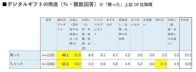 デジタルギフトの用途を聞いたところ、「贈った」「もらった」どちらも最多は「誕生日プレゼント」で、「頂き物やお世話になった際のお返し」が続いた。また、「母の日にもらった」も11.9%と比較的多かった。