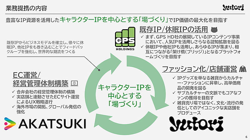 提携を通じて、IP事業の拡大や海外展開の加速など、多面的な協業を進める。IP事業では、yutoriグループのアパレル・コスメブランドとGPS HDのIPコンテンツ事業を組み合わせたコラボレーションを実施し、新規顧客の獲得やブランド価値向上を図る。