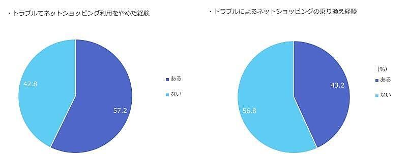トラブルによるネットショッピングの乗り換え経験は「ある」が43.2%、「ない」が56.8%。乗り換えたことがあるは4割を超えていることがわかった。