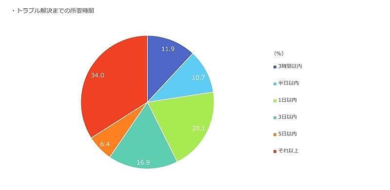 トラブル発生時に問い合わせをした際、解決までに要した時間を聞いたところ、「3時間以内」が11.9%、「半日以内」が10.7%、「1日以内」が20.1%だった。