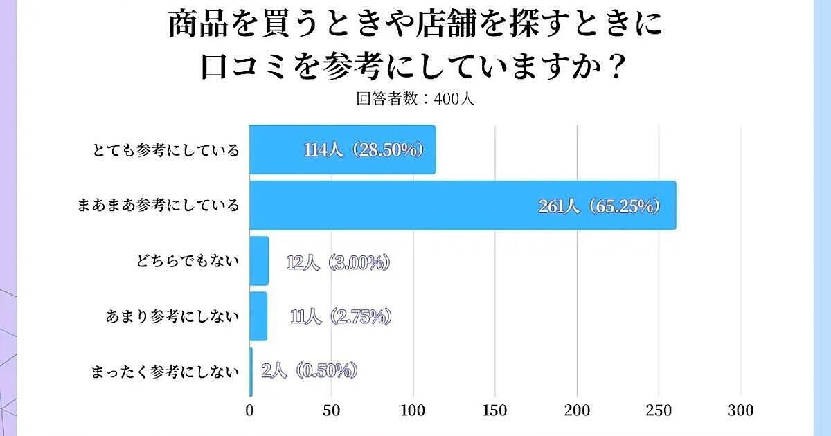 LeveL.Lが実施した「口コミが購買や集客に与える影響」に関する調査によると、商品購入時や店舗を探す時に約94%が口コミを参考にしている。信頼できる口コミは「投稿内容が具体的」「写真・動画がある」が上位にあがった。また、悪い口コミを見た時に企業の返信対応を見る割合は約67%にのぼった。