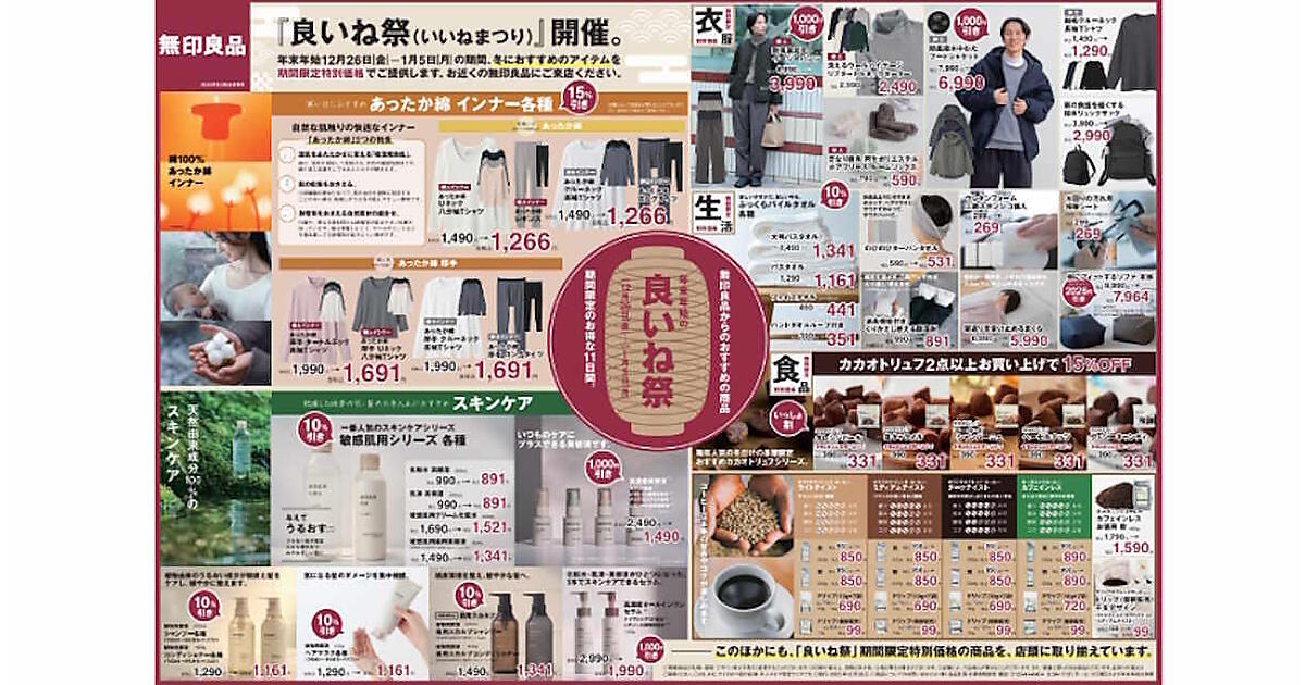 良品計画は12月26日から、「無印良品」で季節のおすすめ商品を特別価格で販売する「良いね祭(いいねまつり)」を実施する。自社ECサイト「無印良品ネットストア」では2026年1月6日まで、店舗は同1月5日まで。