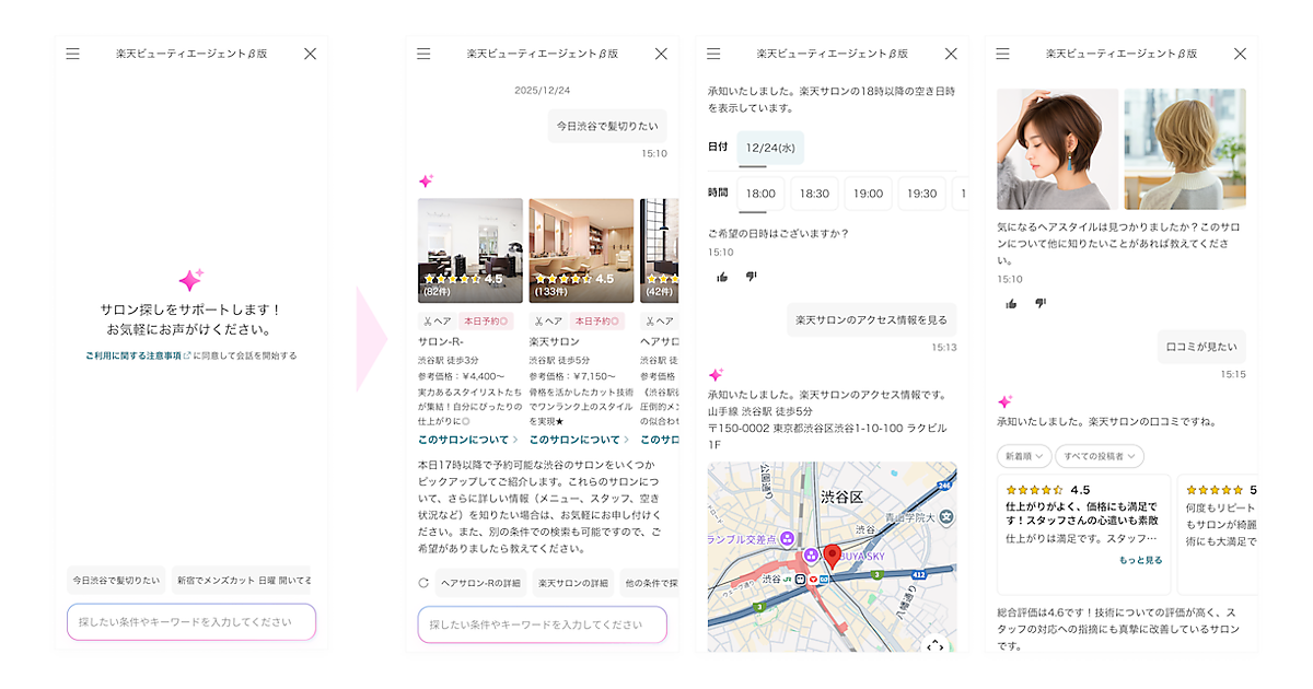楽天グループは12月24日から、サロン予約サービス「楽天ビューティ」で最適なサロン選びを支援するAIエージェント「楽天ビューティエージェント(β版)」の提供を開始した。ユーザーは自身のニーズに合ったサロンを、より簡単かつ効率的に探せるようになる。