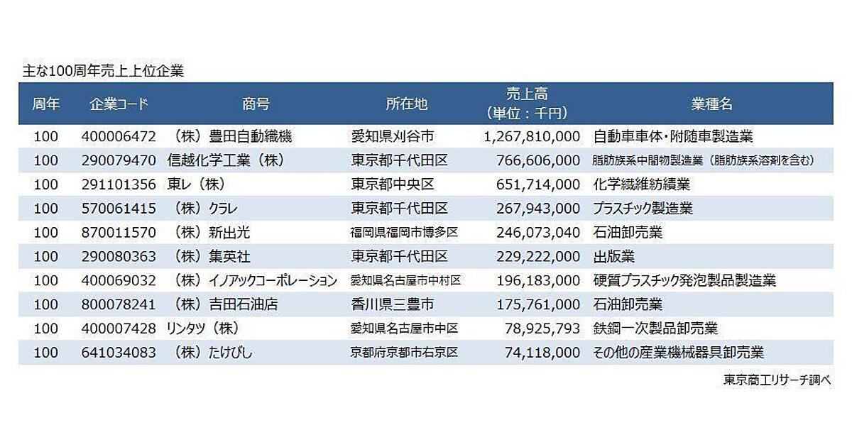 2026年に100周年を迎える企業で売上高トップは、トヨタグループの源流である豊田自動織機。そのほか、信越化学工業、東レ、クラレ、新出光、集英社、イノアックコーポレーションなどが名を連ねた。