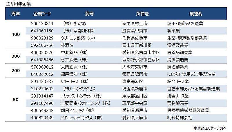 1726年創業で300周年を迎える企業は、医薬品卸の「中北薬品」(愛知)、酒蔵「松井酒造」(京都)の2社。200周年(1826年創業)は、酒蔵「大門酒造」(大阪)、醤油製造の「福寿醤油」(徳島)の2社となっている。
