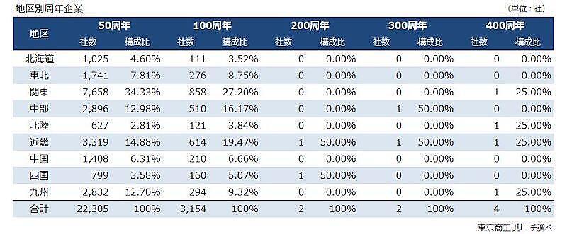 地区別に見ると、100周年企業が最も多いのは関東の858社で、構成比は27.2%となった。近畿が614社(19.4%)、中部が510社(16.1%)、九州が294社(9.3%)、東北が276社(8.7%)、中国が210社(6.6%)と続いている。