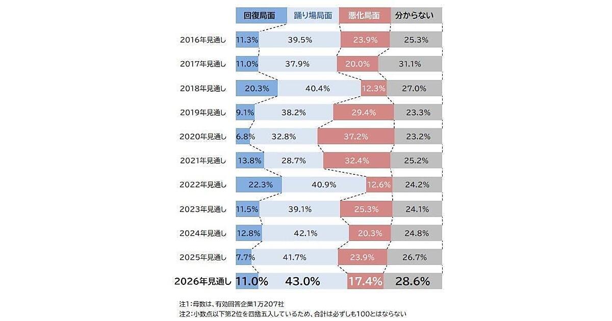 帝国データバンク(TDB)はは、全国の企業を対象とした「2026年の景気見通しに対する意識調査」の結果を公表した。それによると2026年の景気見通しについて、「回復局面」と回答した企業は11.0%で前年から3.3ポイント増加、2年ぶりに1割を超えた。「踊り場局面」は同1.3ポイント増の43.0%で、3年連続で4割超に。「悪化局面」は同6.5ポイント減の17.4%で、4年ぶりに2割を下回った。「分からない」は同1.9ポイント増の28.6%だった。
