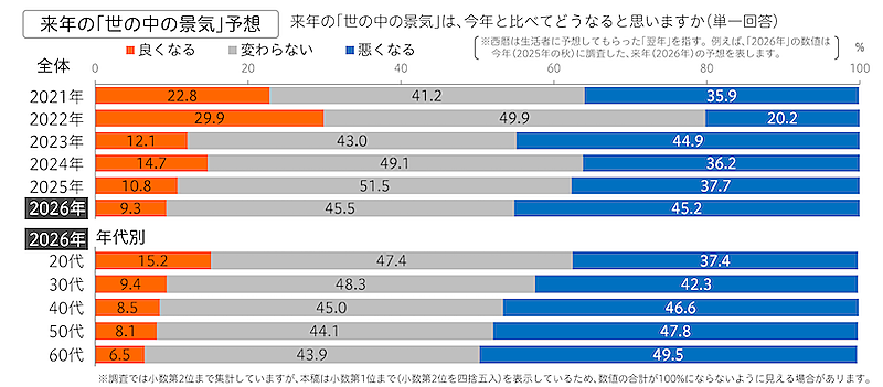 博報堂生活総合研究所が全国の生活者を対象に実施した「生活者にきいた“2026年 生活気分”」調査によると、2026年の「世の中の景気」は「悪くなる」が前年比7.5ポイント増の45.2%となり、2015年の調査開始以降で最大となった。「良くなる」は前年比1.5ポイント減の9.3%、「変わらない」は同6.0ポイント減の45.5%だった。