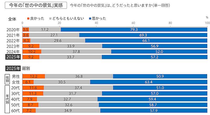 なお、2025年の景気実感は「悪かった」が57.2%で、前回調査(52.0%)から5.2ポイント増加した。性別で見ると、女性は「悪かった」が63.4%で、男性の50.9%を大きく上回った。