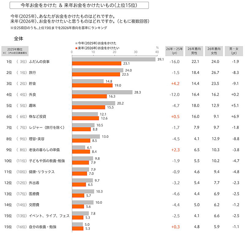 3位の「貯金」は、「今年(2025年)お金をかけた」よりも「来年(2026年)お金をかけたい」が4.2ポイント高かった。そのほか、9位の「老後の暮らしの準備」は、「来年お金をかけたい」が8.4%、「今年お金をかけた」が6.1%で、差は2.3ポイントだった。長期的なお金の使い方や将来への備えに目を向ける傾向も見られた。