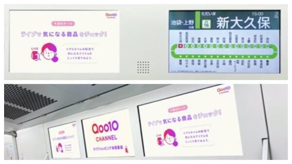 「Qoo10 CHANNEL」は、JR東日本の首都圏主要10路線とゆりかもめの車内に搭載されたデジタルサイネージネットワーク「TRAIN TV」で放映する。トレインチャンネル、まど上チャンネル、サイドチャンネルなどの車内サイネージを対象に、通勤・通学客に向けて「Qoo10」のライブショッピングの世界観を訴求する。