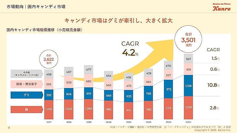 カンロによると、国内人口は縮小しているものの、グミの喫食人口は拡大しており、グミ市場の競争は激化傾向にあるという。