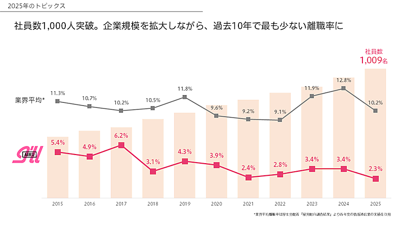 アイルは2026年に創業35周年を迎える。2025年には社員数1000人を超え、離職率も過去10年で最も少なくなった。また、2本社・1支社・開発ラボの計4拠点体制へと拡大。リーマンショック以降も業績を大きく落とすことなく、事業成長を続けてきた。