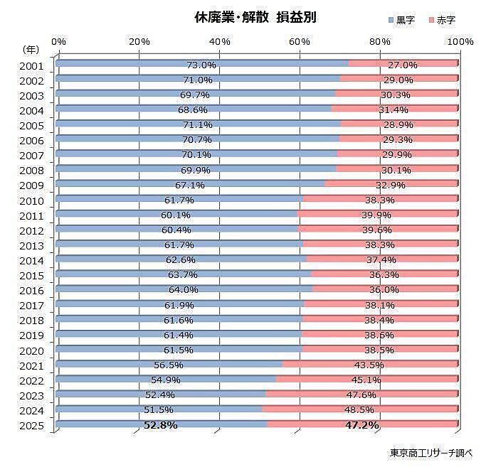 休廃業・解散直前期の決算を見ると、2025年の黒字企業率は52.8%で、前年比1.3ポイント改善した。一方、赤字企業率は47.2%と、ほぼ半数が赤字のまま市場から退出している。