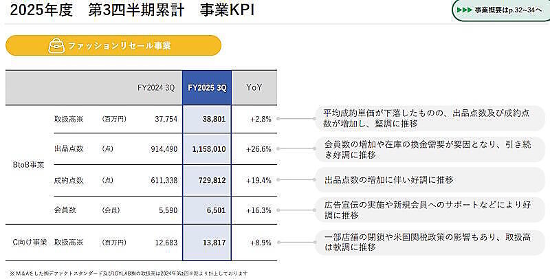 オークネットの2025年1-9月期(第3四半期累計)の連結業績によると、ファッションリセール事業のうち、BtoB事業の取扱高は前期比2.8%増の388億100万円。toC向け事業の取扱高は同8.9%増の138億1700万円。旧デファクトスタンダードとJOYLABは、toC向け事業にあたる。取扱高は2025年4月(第2四半期)から計上している。