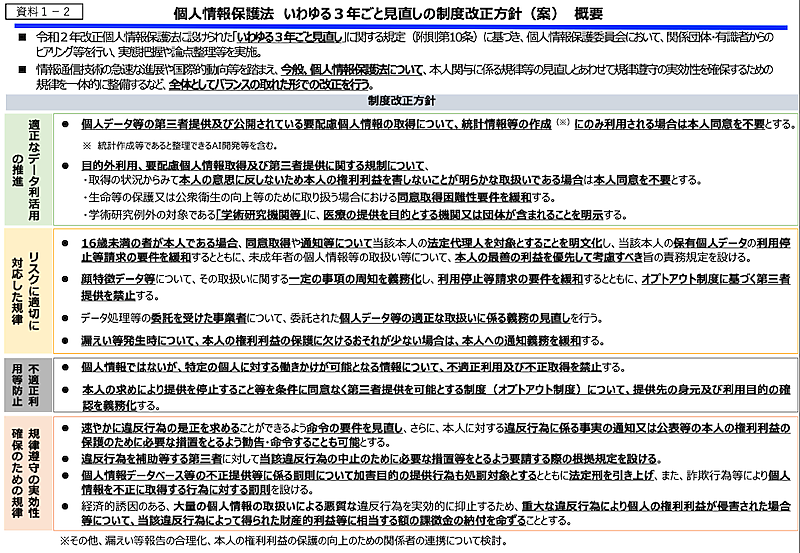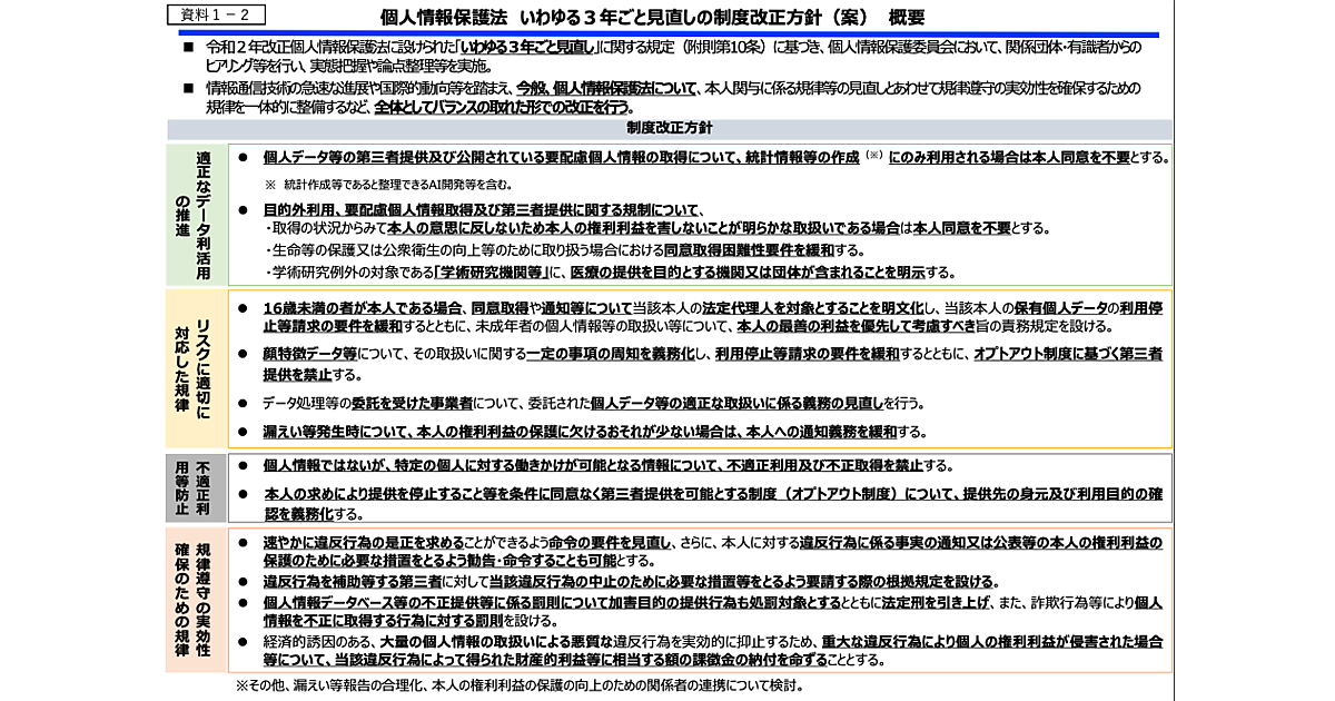 個人情報保護法は国際動向、技術進展(AIなど)、新ビジネスの状況を踏まえ、法律の実効性を検討し必要に応じて改正を行う「3年ごと見直し」規定がある。保護委は2023年11月から検討を開始。政府は2025年6月に「データ利活用制度の在り方に関する基本方針」と関連する各種政府決定をとりまとめ、個人情報保護法の改正案については「早期に結論を得て提出することを目指す」こととされていた。