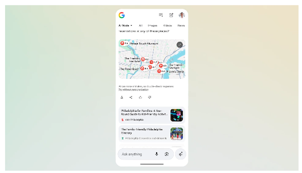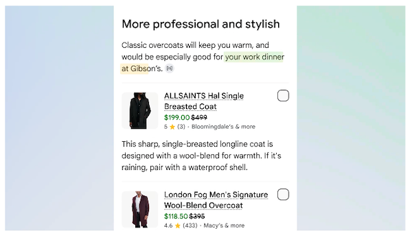 たとえば「次の旅行用に新しいコートが欲しい」と検索すると、AIモードはユーザーの好みや旅行先の気候条件を踏まえ、防風性があり、かつ「いつもの雰囲気」に合うコートを提案する。Googleはこれを「あなたの旅程と好みを理解しているパーソナルショッパーのような体験」と表現している。