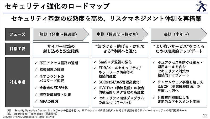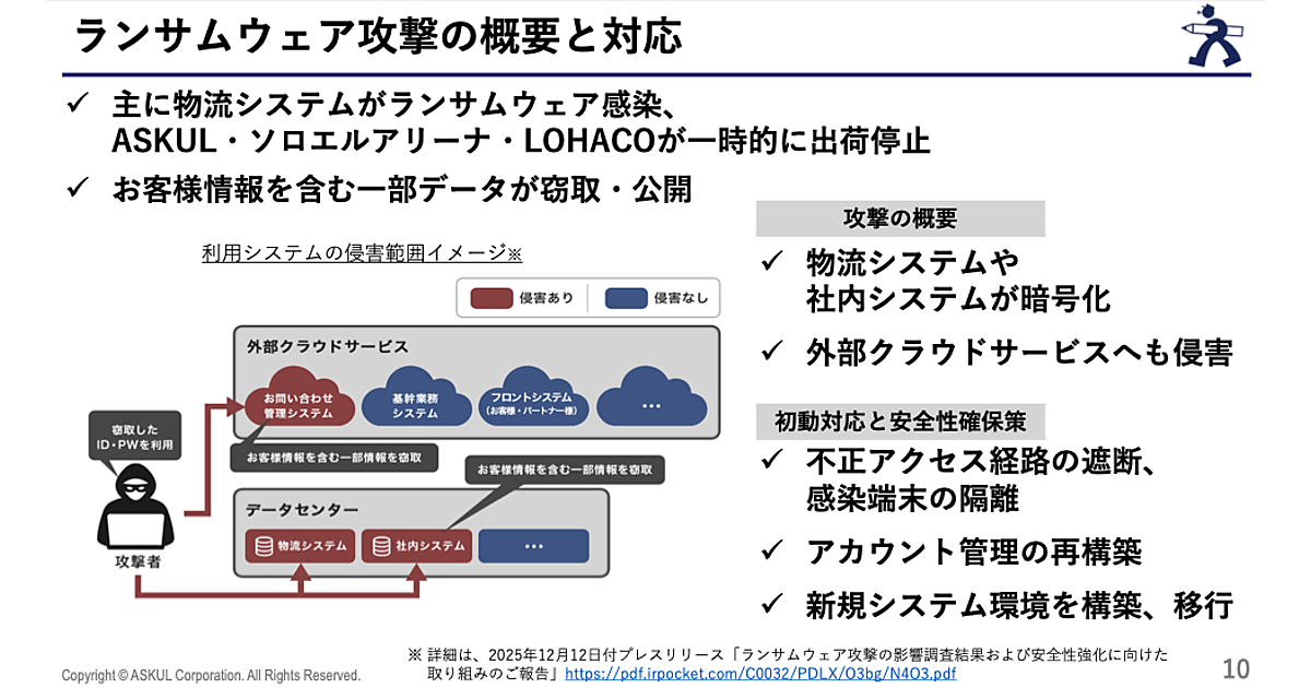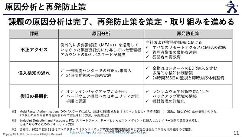 2025年12月12日には、影響調査結果と安全性強化に向けた取り組みを公表し、攻撃手口や被害範囲、再発防止策、復旧対応などを開示。今回の決算説明会では、これらの内容を改めて説明した。