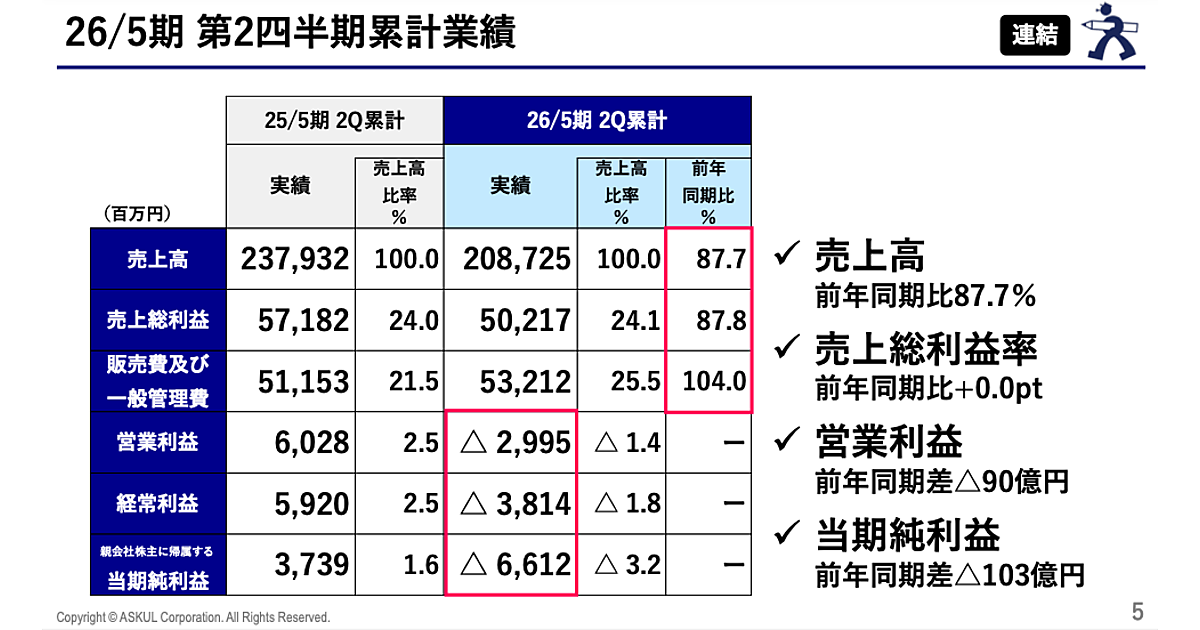 アスクルは1月28日、2025年6-11月期(中間期)の連結決算を発表した。売上高は前年同期比12.3%減の2087億2500万円、営業損益は29億9500万円の赤字(前年同期は60億2800万円の黒字)、経常損益は38億1400万円の赤字(前年同期は59億2000万円の黒字)、中間純損益は66億1200万円の赤字(前年同期は37億3900万円の黒字)となった。