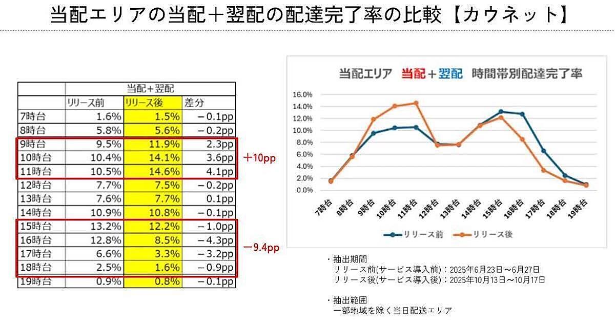 「当日選択式サービス」の導入後、当日配送エリアにおける午前9時台から11時台の配達完了率は10.0ポイント向上。配達ルートの終盤にあたり終了時間の遅れに直結しやすい15時台から18時台では、9.4ポイントの減少が見られたという。