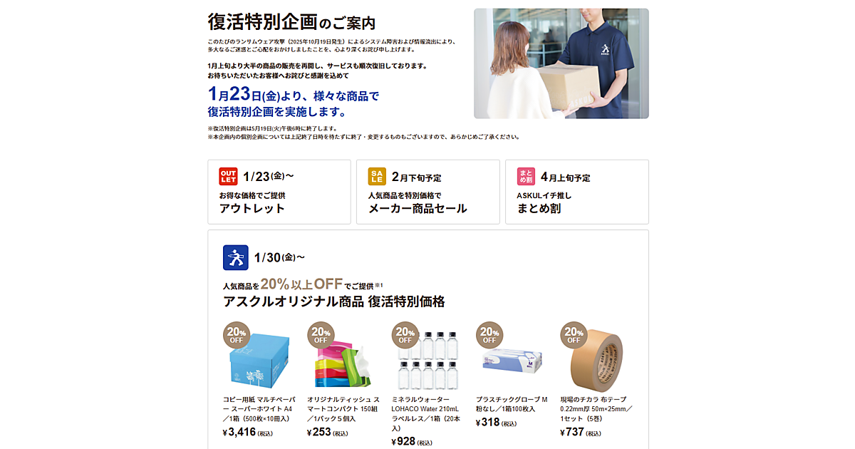 ランサムウェア攻撃によるシステム障害からの復旧を進めているアスクルが、BtoB向け通販で大規模な値下げ施策に踏み切る。事業所向け通販サービス「ASKUL」「ソロエルアリーナ」で、1月23日からアウトレット企画を皮切りに「復活特別企画」をスタート、1月30日からはオリジナル商品500点以上を20%以上値下げする。