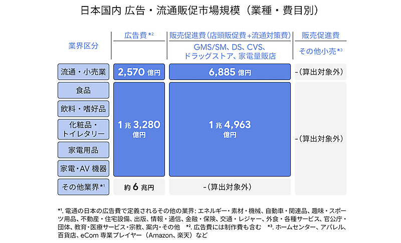 メーカーと小売企業全体の販売促進費(メーカーの店頭販促費、営業企画費、流通対策費、小売企業の販売促進費など)を推計し、リテールメディア広告出稿の原資として注目すべき9領域を特定した。