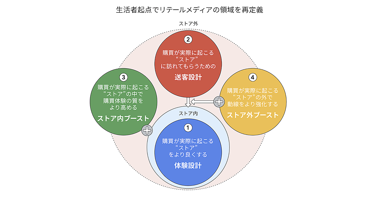 体験設計と送客設計は、主に小売企業が追求すべき領域。ここで強固な土台を作って初めて、広告・販促機能としての「ブースト」が価値を持つとしている。