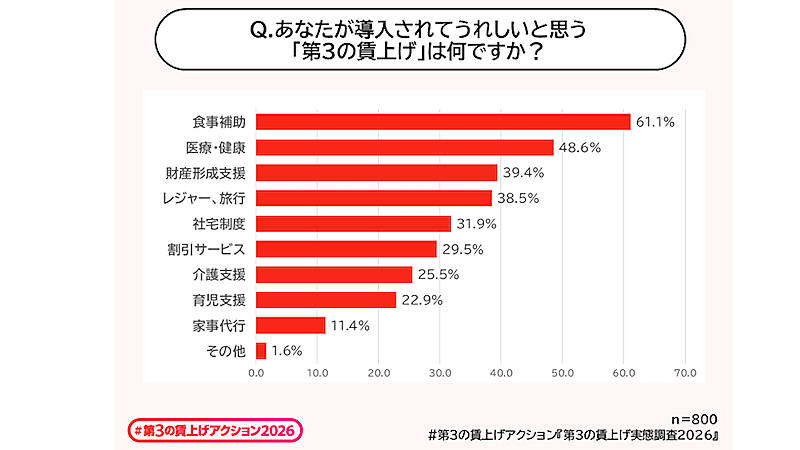 導入されてうれしい「第3の賃上げ」(福利厚生)として、「食事補助」が61.1%で最多となった。続いて「医療・健康」(48.6%)、「財産形成」(39.4%)が上位に入り、生活支援系への関心が高い。