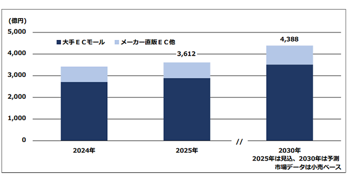 調査によると、2025年の市場規模は3612億円の見込み。内訳では、「Amazon」「楽天市場」などの大手ECモールが全体の8割弱を占める。