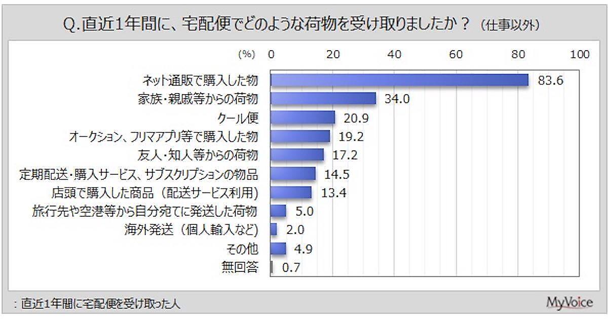 直近1年間に宅配便で受け取った荷物の内容で、最も多かったのは「ネット通販で購入した物」で83.6%、続いて「家族・親戚などからの荷物」が34.0%、「クール便」が20.9%だった。