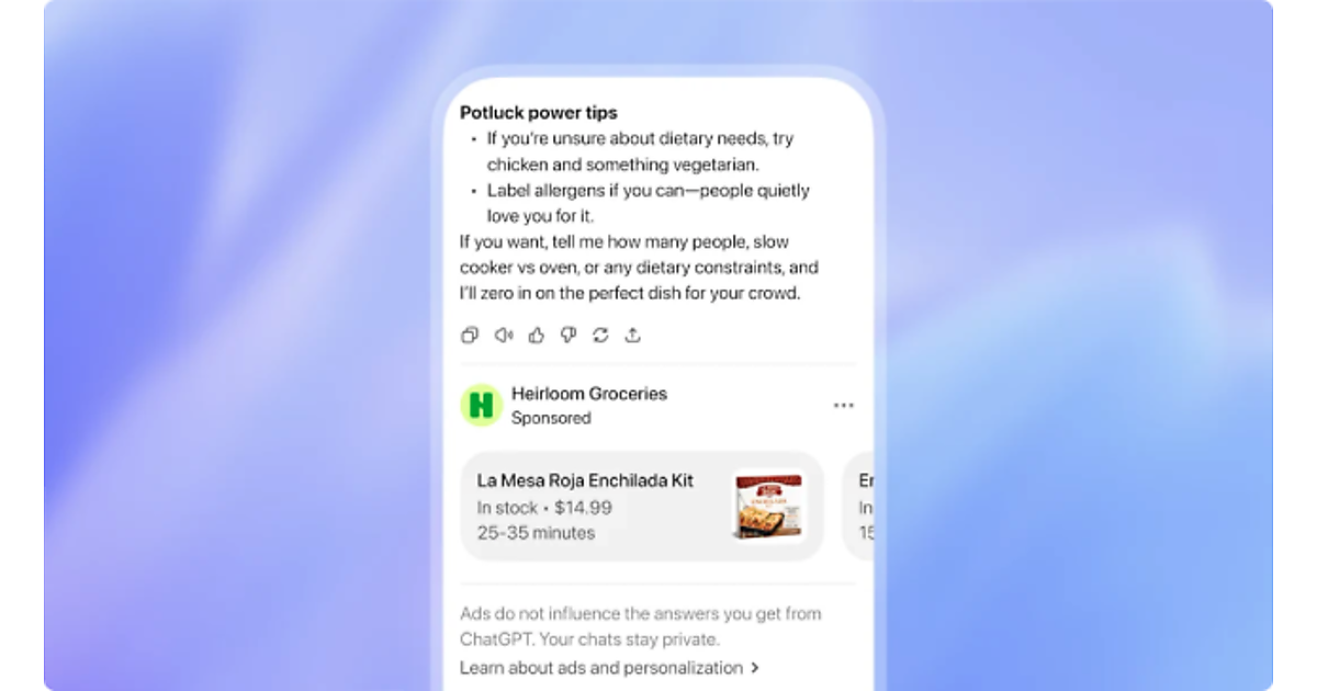 広告配信は、広告主が提出したクリエイティブ、会話のトピック、過去のチャット、広告への過去のアクションなどを照合して決定する。たとえば、レシピを調べている場合、ミールキットや食料品配達の広告が表示される可能性があるという。複数の広告主が存在する場合は、会話との関連性が最も高い広告を優先表示する仕組みだ。