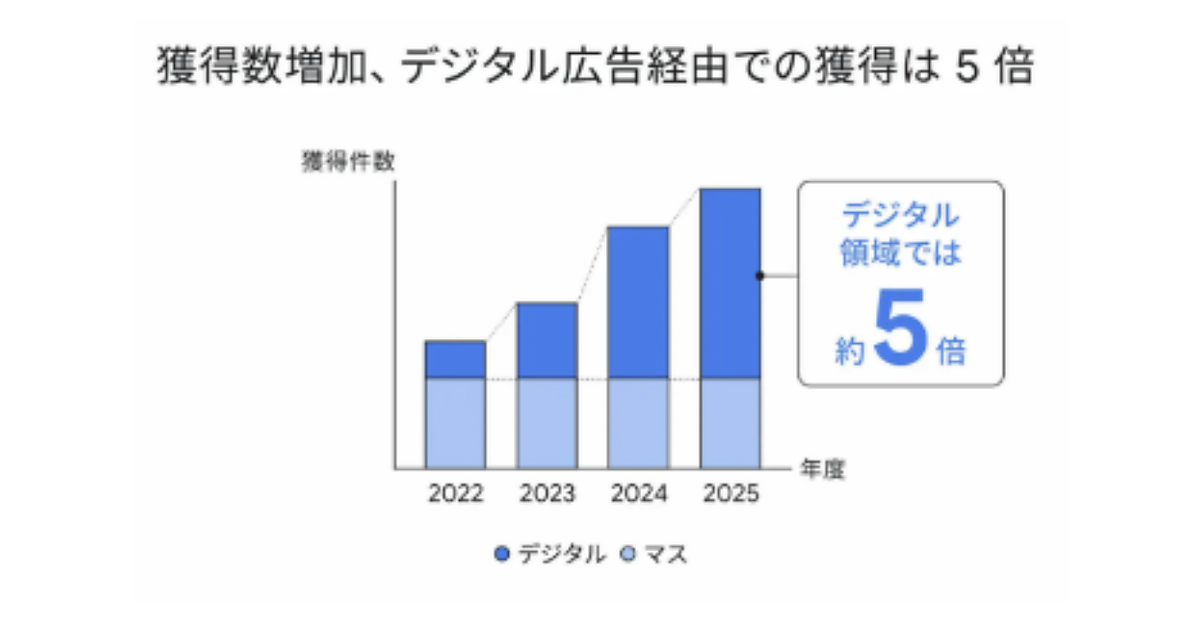 獲得件数も2023年から2025年にかけて5倍に成長した。さらに検索広告での成功を起点に、Googleの全広告枠に自動配信できる成果最大化メニュー「P-MAX(Performance Max)」や、Googleが提供するさまざまなサービス面に広告を配信できる「Demand Gen」も同様の方針で運用。その結果、従来はシニア層中心だった顧客基盤が変化し、2025年3月には20代がデジタルチャネルで最も獲得の多い層になった。
