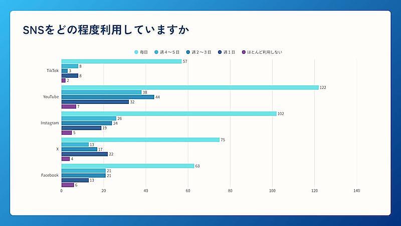 利用頻度については、TikTok、YouTube、Instagram、X、Facebookのいずれも「毎日利用」が最も多い結果となり、各プラットフォームで「毎日利用」が50人以上となった。