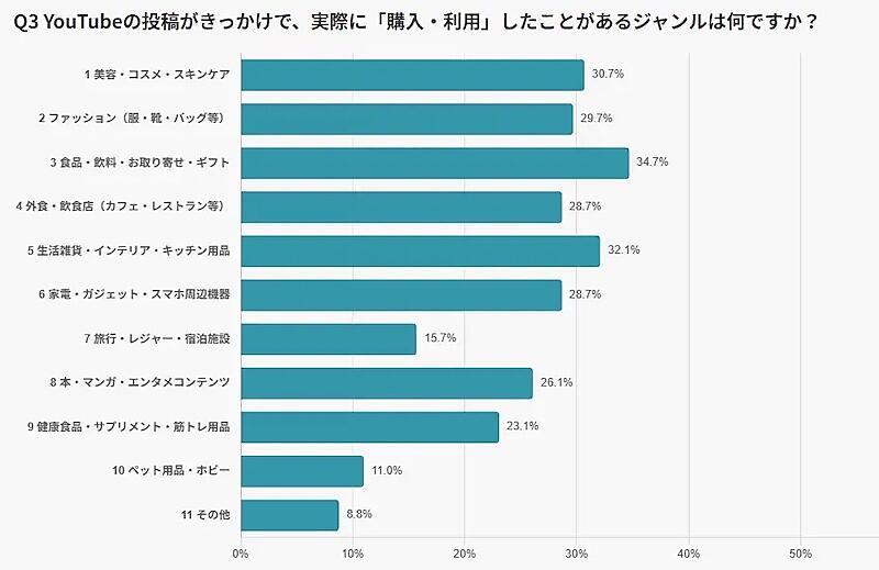 「YouTube」をきっかけとした購買経験を持つ人に、実際に「購入・利用」したことがあるジャンルを聞いたところ、最も多かったのは「食品・飲料・お取り寄せ・ギフト」で34.66%、続いて「生活雑貨・インテリア・キッチン用品」が32.07%、「美容・コスメ・スキンケア」が30.68%、「ファッション(服・靴・バッグなど)」が29.68%だった。