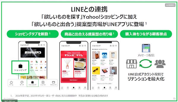 2026年度の重点の1つ目にあげたのがLINEとの連携の本格化だ。出澤社長は「従来から伝えている通り、LINEとの連携が本格的に始まる年になる」と説明。これまで「Yahoo!ショッピング」を売り場として活用してきたが、今後は「LINEヤフーショッピング」「LINEヤフーコマース」として、提案型売り場を提供しユーザーのあらゆる接点で売り場や会話が広がるような戦略を検討しているとした。