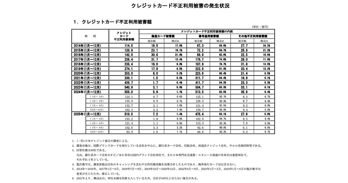 一般社団法人日本クレジット協会は3月6日、2025年(1〜12月)のクレジットカード不正利用被害の集計結果を公表した。それによると、2025年通年の不正利用被害額は前年比8.0%減の510億5000万円、不正利用発生率は0.038%だった。