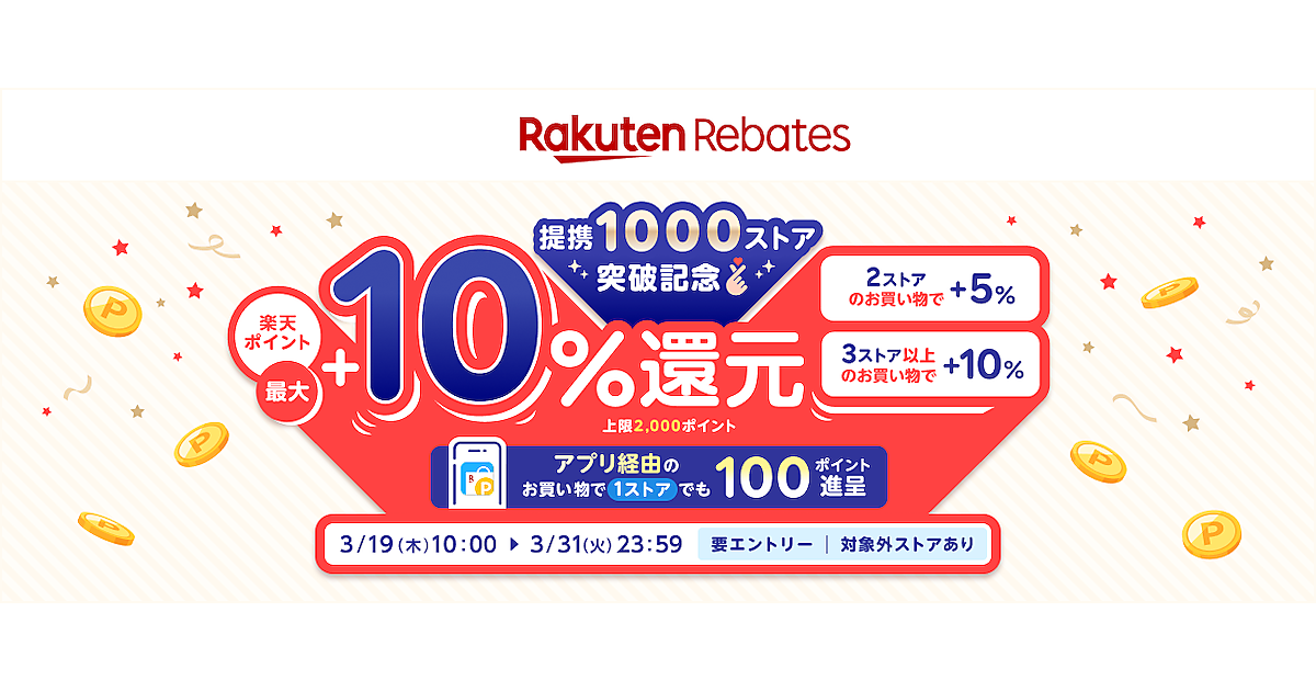 楽天グループは3月16日、ポイントサイト「楽天リーベイツ(Rebates)」の提携ストア数が1000ストアを突破したと発表した。これを記念し、「提携1000ストア突破記念キャンペーン」を3月19日10時から3月31日23時59分まで実施する。