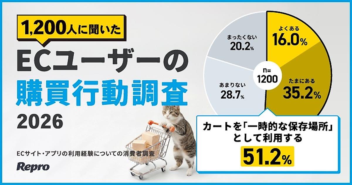 Reproが実施したECユーザーの購買行動に関する消費者調査によると、ECユーザーの約半数がカートを「一時的な保存場所」として利用していることがわかった。カートに商品を入れたまま購入しない理由は、ほかの商品やECサイトとの比較、クーポンやキャンペーン確認が上位にあがった。