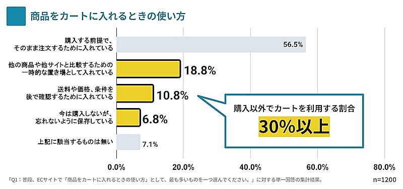 カートに商品を入れる際の利用目的は、「購入する前提で、そのまま注文するため」が最多で56.5%。続いて「他の商品や他サイトと比較するための一時的な置き場として入れている」が18.8%、「送料や価格、条件を後で確認するために入れている」が10.8%、「今は購入しないが、忘れないように保存している」が6.8%だった。購入以外の目的でカートを利用する割合は合計36.4%。
