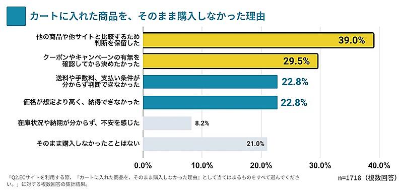 ECサイトを利用する際、カートに商品を入れたもののそのまま購入しなかった理由として最も多かったのは「他の商品や他サイトと比較するため、判断を保留した」で39.0%。続いて「クーポンやキャンペーンの有無を確認してから決めたかった」が29.5%、「送料や手数料、支払い条件が分からず判断できなかった」「価格が想定より高く、納得できなかった」がそれぞれ22.8%だった。